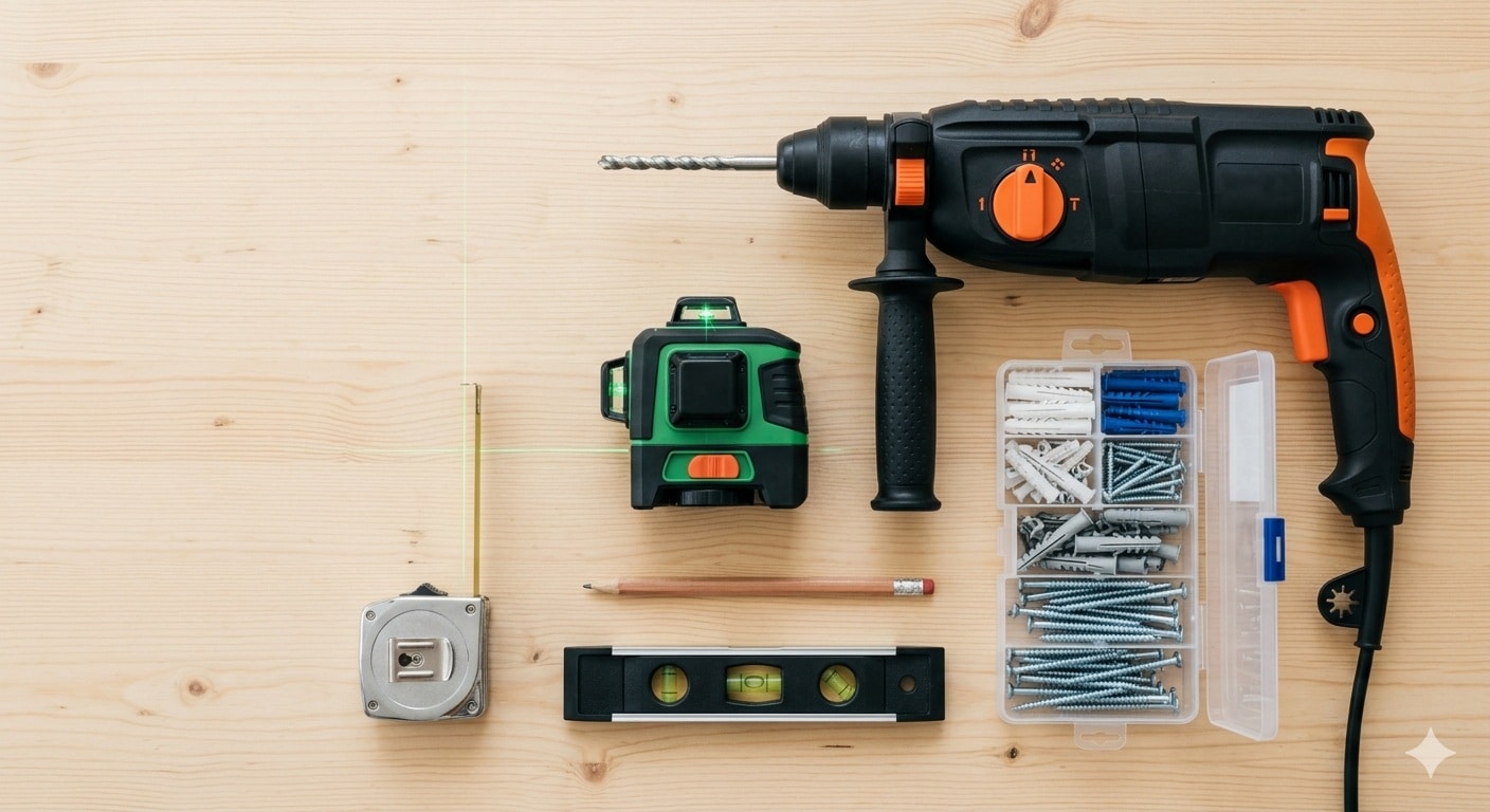 - Перфоратор или бормашина — за пробиване на отвори в стената; при тухла и бетон е задължителен перфоратор