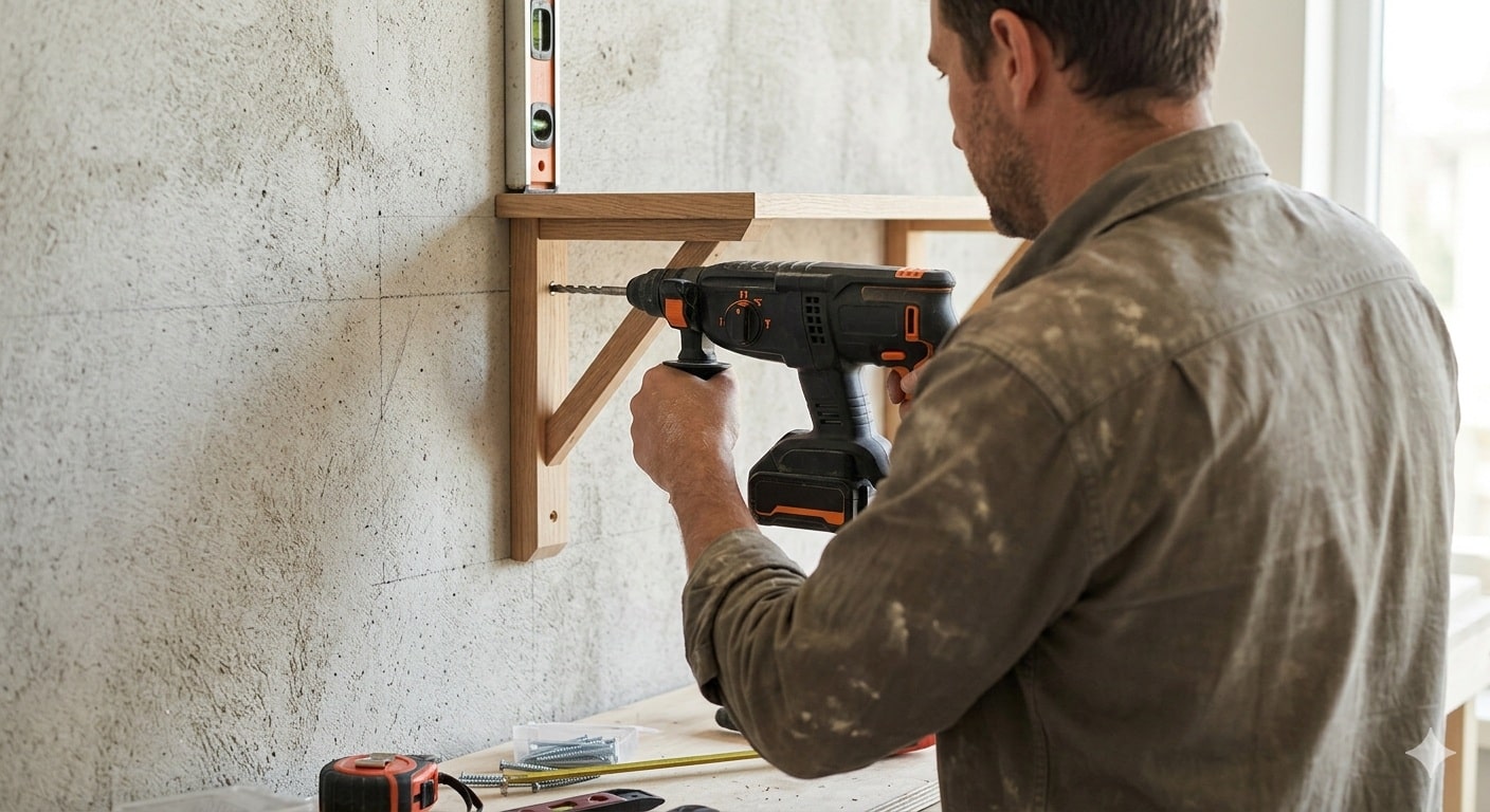 С перфоратора пробий отворите на необходимата дълбочина — обикновено 5–6 см за тухлена стена. Работи на ниска скорост в началото, за да не се хлъзне свредлото. При гипсокартонена стена без носещи елементи зад нея използвай специални болтове тип „toggle“ или разпъващи дюбели за по-голяма здравина. След пробиването почисти отвора от прах — можеш да духнеш в него или да използваш малка четка. Дюбелът трябва да влезе плътно с леко почукване, без да се върти.
